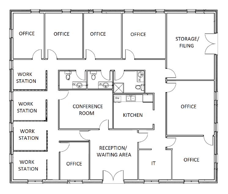 - Buildout consists of 7 offices, 4 work stations, conference room, 3 restrooms, reception/waiting area, kitchen, and filing/storage area