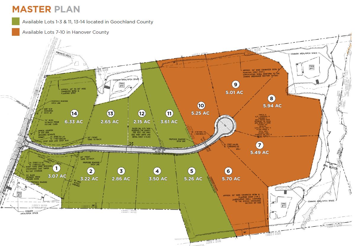 - Lots 1-5 & 11-14 located in Goochland and Lots 6-10 in Hanover – county line roughly divides half the property